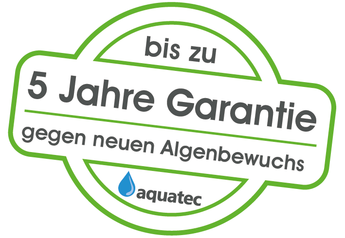 Bei aquatec erhalten Sie eine besondere Imprägnierung. Diese sorgt dafür, dass sich Schmutz deutlich langsamer wieder festsetzt – dafür geben wir bis zu 5 Jahre Garantie gegen erneute Veralgung.